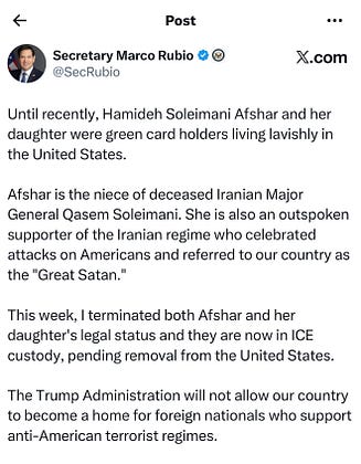 BREAKING: Hamideh Soleimani Afshar is the niece of Major General Qasem Soleimani, the commander of the IRGC’s Quds Force who was killed by a US drone strike in Baghdad in January 2020. She held a United States green card. She lived in Tujunga, California, in the suburbs of Los Angeles. She maintained an Instagram account from American soil on which, according to the State Department, she promoted Iranian regime propaganda, celebrated attacks against American soldiers and military facilities in the Middle East, praised the new Supreme Leader, denounced the United States as the “Great Satan,” and voiced what the Department described as “unflinching support for the Islamic Revolutionary Guard Corps,” the organisation the United States designates as a foreign terrorist organisation. She did this while living under the legal protection of the country she was calling the Great Satan.