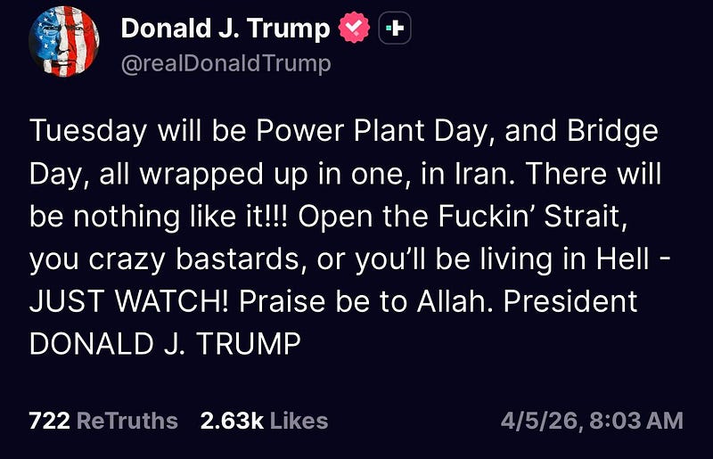 BREAKING: The President just declared Tuesday “Power Plant Day and Bridge Day” on Truth Social at 8:03 AM Easter Sunday. The exact words: “Open the Fuckin’ Strait, you crazy bastards, or you’ll be living in Hell. JUST WATCH. Praise be to Allah.” The timing is not incidental. It is surgical. US markets reopen Monday April 6. European markets do not. The London Stock Exchange, Frankfurt, Paris, and every major European exchange observe Easter Monday and remain closed through April 6. They reopen Tuesday April 7. Power Plant Day. Europe will wake up from a four-day trading blackout into whatever the President does on Tuesday. America gets one day to price the deadline. Europe gets zero.