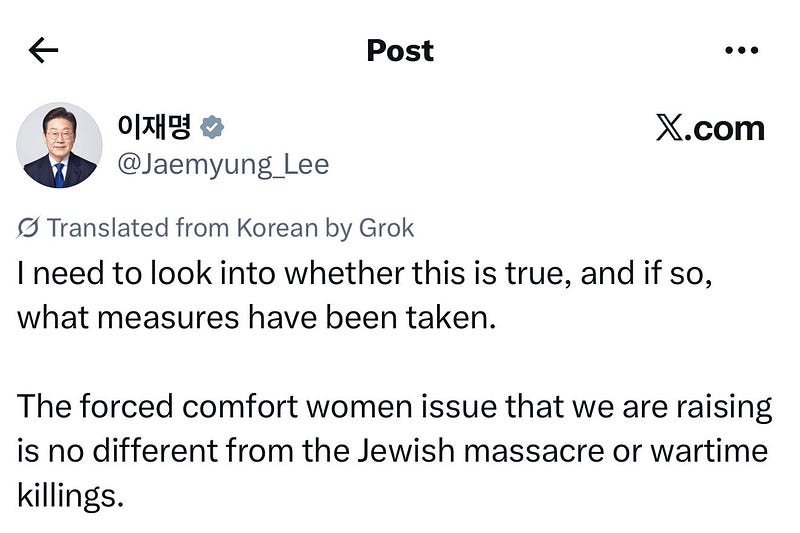 South Korean President Lee Jae-myung quote-tweeted a video on April 10 from a Palestinian account claiming to show IDF soldiers “torturing a Palestinian kid and throwing him off a roof.” He wrote: “I need to look into whether this is true, and if so, what measures have been taken. The forced comfort women issue that we are raising is no different from the Jewish massacre or wartime killings.”
