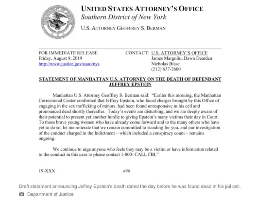This image from the Epstein files is a draft press release from August 9, 2019 announcing Jeffrey Epstein was found dead in his jail cell.