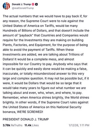 So debilitating in fact that he states ‘we’re screwed’ if the Supreme Court rules the government has to reimburse the cost of the tariffs taxes.