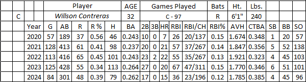 After researching the first five catcher ranked by NFBC ADP, Contreras is the clear drop off in playing time based on previous years. He has never had more than 475 at-bats in his nine seasons in the majors. Last year, the Cardinals had him on the field for 84 games due to two long stints in the injured list (forearm and finger issues). His draft momentum is tied to St. Louis moving Contreras to first base in 2025 while expecting some time at DH, pointing to his best opportunity in his major league career.