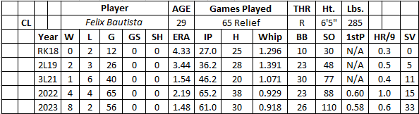 Heading into 2022, Bautista had only 31.2 innings of experience between AA (13.1 – 0.68 ERA) and AAA (18.1 – 2.45 ERA). His command (5.1 walks per nine) held back his development and opportunities to close games (18 saves in the minors). With Baltimore, batters only hit .167 against him, thanks to an electric fastball (99.2 mph) and unhittable split-finger pitch (.086 BAA with 60 strikeouts and one walk over 93 at-bats). The Orioles handed him the closing job at the trade deadline, leading to 13 saves in 14 chances with a 3.24 ERA and 36 strikeouts over 25 innings.