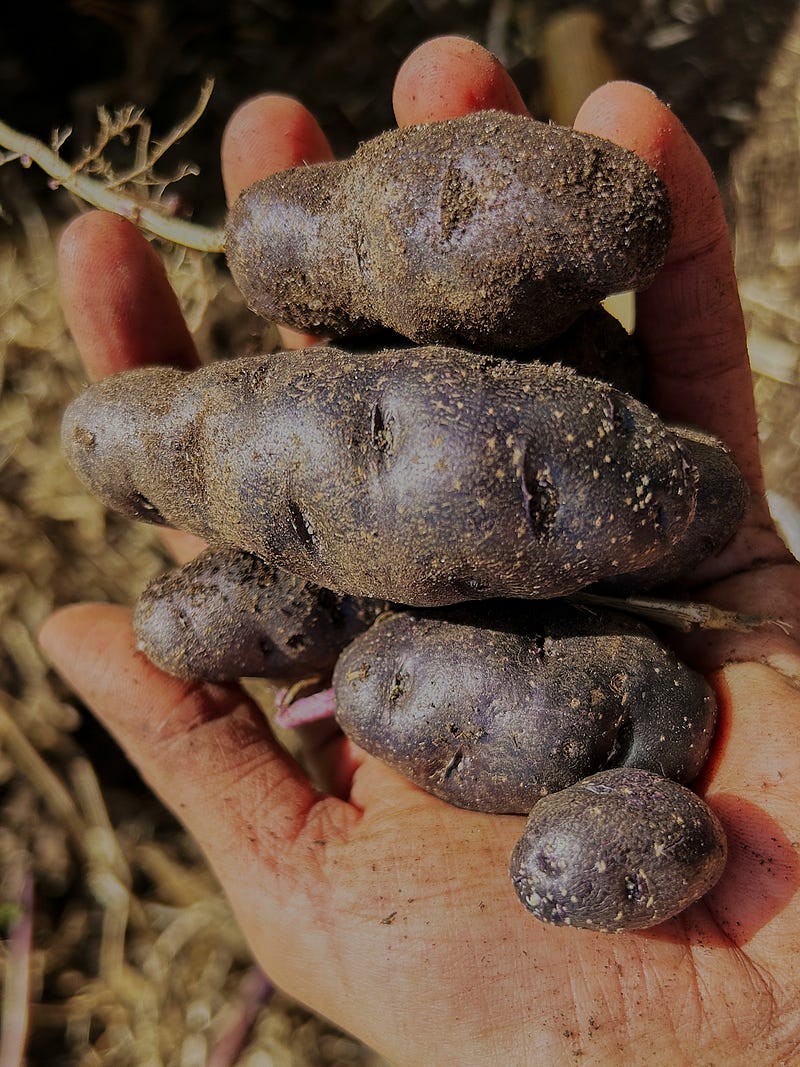 From left to right are: purple viking, dark red norland, huckleberry gold, purple Peruvian, red thumb (pre-nuclear; I’m excited to share what this means!), and Russian banana. There are so many colors, textures, flavors, and regions from around the globe to explore with the 28 varieties I’ve grown! Coming very soon…