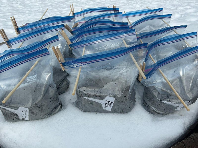 I’ve finally braved the snowy wilds of the backyard and placed my winter sowing setup in our fire pit. (It’s above freezing right now, and it felt like the tropics!) Sadly, we still have many weeks left at subzero temps for ample cold stratification of these seeds. I’m only trying it with a few of my crops this year, mostly flowers and herbs. Here’s what I’ve planted this way, with in some cases a blend of several varieties of each:
