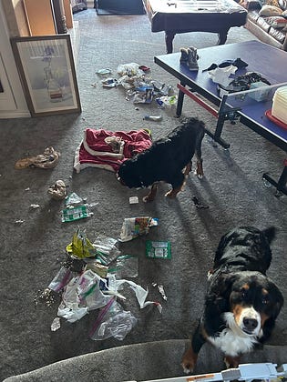 That’s funny, I’d thought The Monsters had slept in a little this morning- until I heard the dulcet tones of the world being ripped apart. And despite looking guilty here in the foreground, it wasn’t Hazel that did it. It was “Mr. 1-Week-Post-Hip-Replacement” Freddy who was just ravaging the plastic recycling. Sigh, I guess he really is feeling better. 🫢
