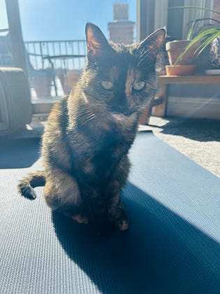 Maya sitting on my mat and telling me in no uncertain terms that it’s yoga time. The bright sunshine makes it even more special to climb all over me! I normally don’t get to my mat until late at night. Shoot, maybe I need to rearrange my schedule. Maya-assisted yoga is the best kind! ❤️