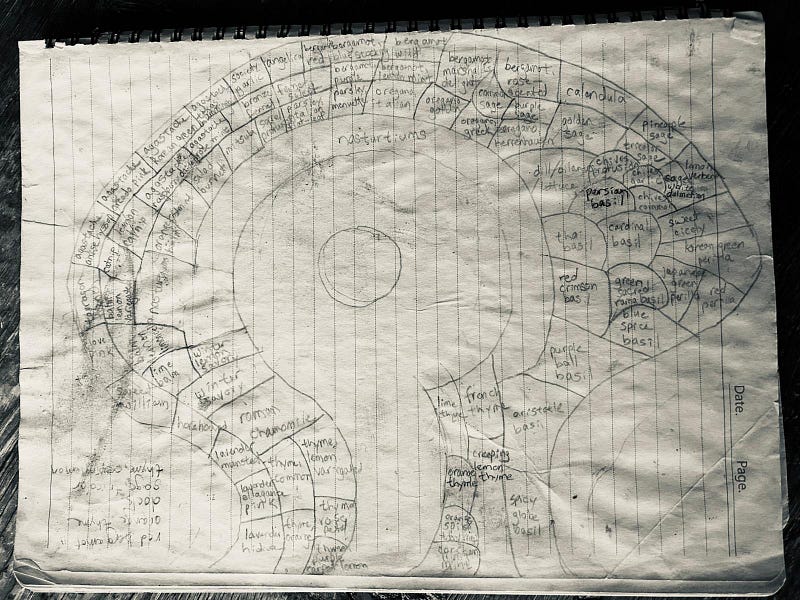 One of my projects this year: digitizing my garden maps! Here’s a photo of my herb garden in 2023, the first year I planted it. After moving in at the end of 2021, it took us a full year to excavate the invasive trees, shrubs, and thick layer of rocks that had completely filled this bed. I was so happy to finally get it planted!