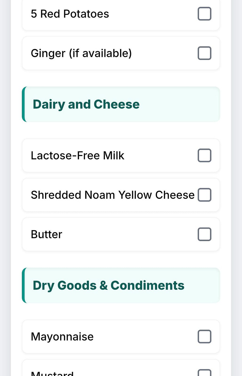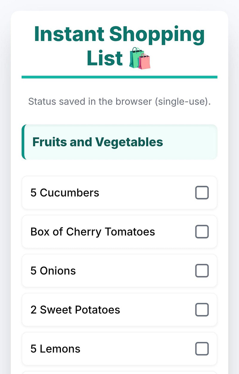 I sent the complete list to Gemini and asked it to create a small mini-app for me, using its Canvas feature. One that would allow me to track the groceries and mark them with a checkmark when picked up, nicely divided by category (vegetables, dairy, meat, etc.).