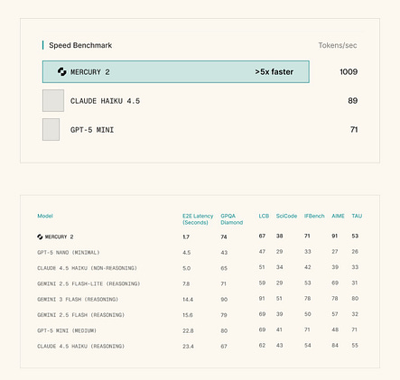 They’re not at the frontier yet. On reasoning benchmarks, Mercury 2 is competitive with Haiku and GPT-5 Mini — not Claude Opus or Gemini Pro. But that’s not the point.