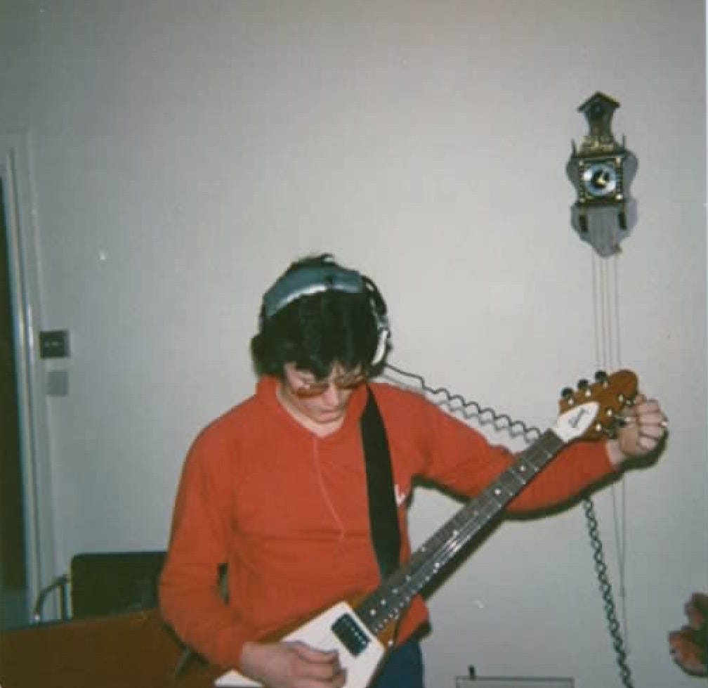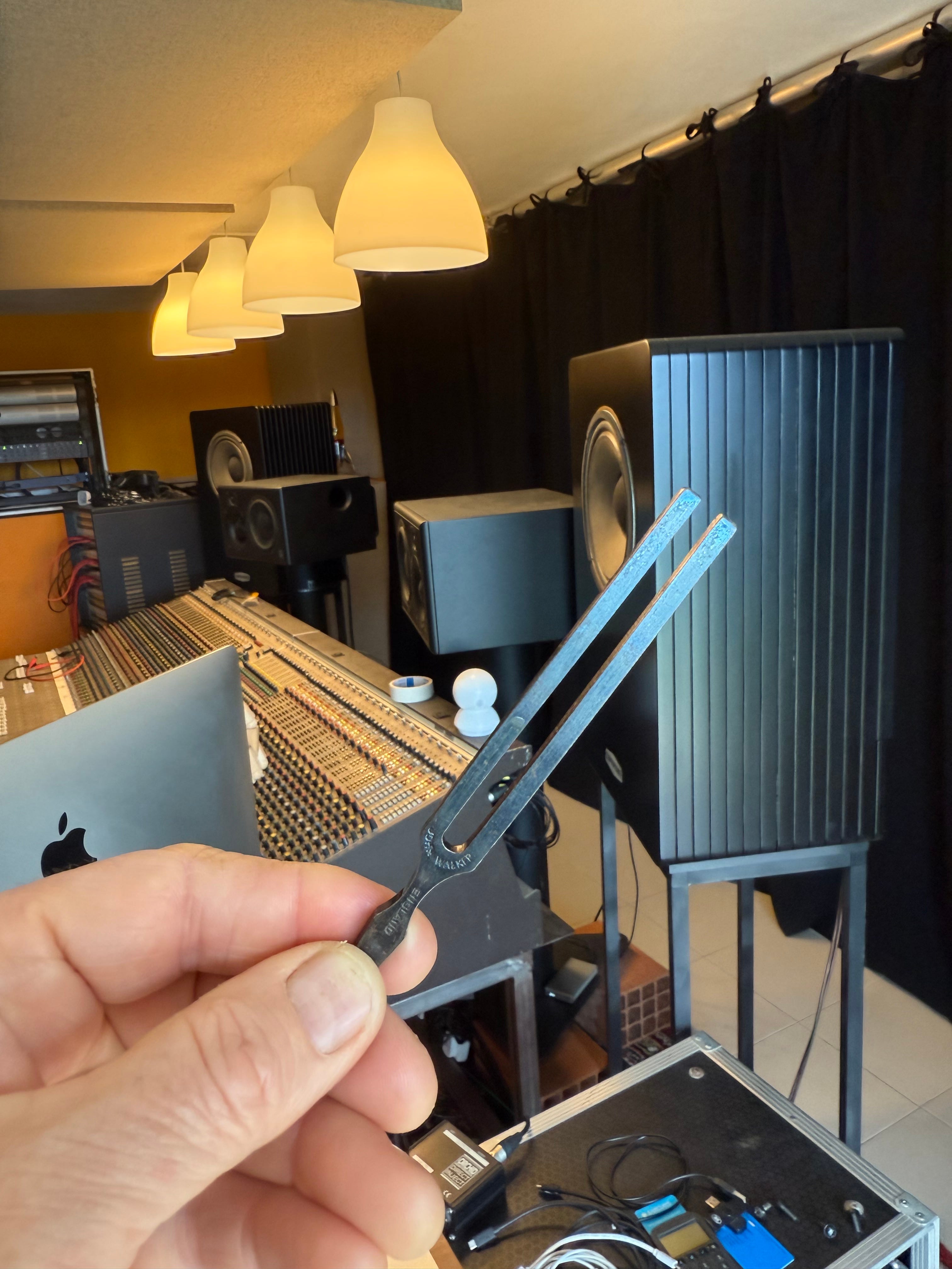 I bought this tuning fork 51 years ago, pinging it on my knee—a hard surface puts them out of tune—and then biting on it. The vibrations go through the bone, and you can tune in surprisingly loud situations. I also used a test tone through modified headphones where I removed one earpiece. Yes, that’s me pictured below when I was 18 🎸🤣