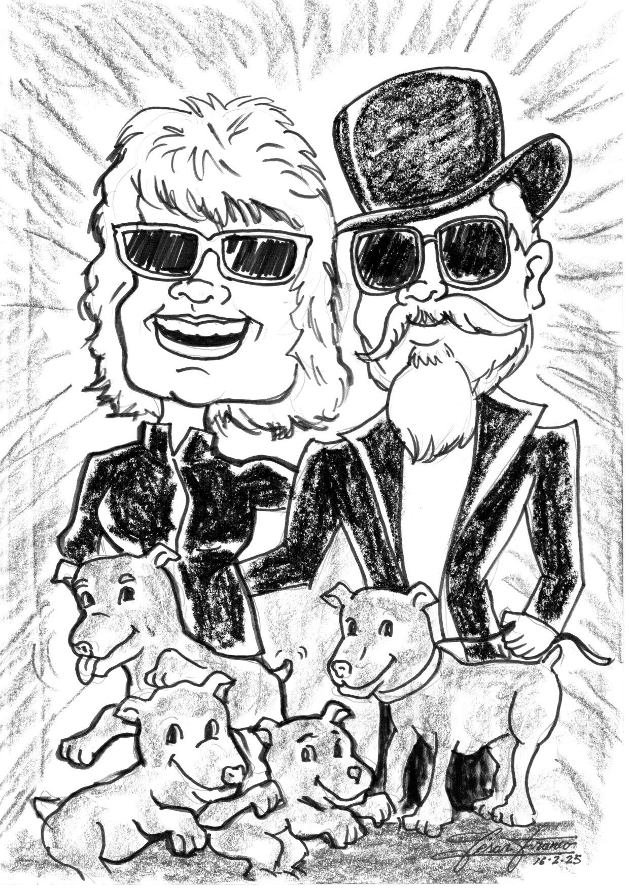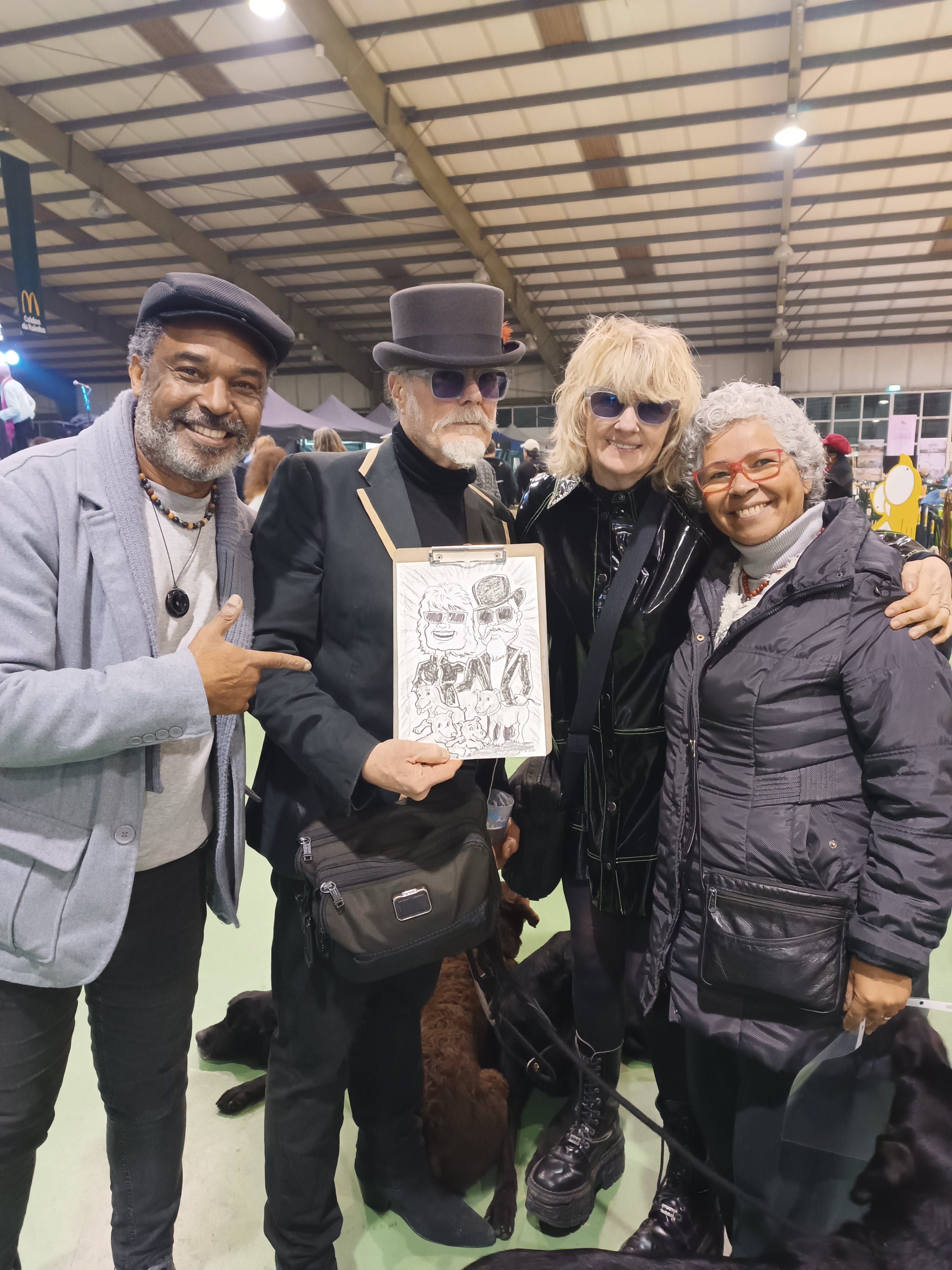 When going out, we do like to be soigńe—it’s a fun thing to do. Suzy’s vinyl dress and my top hat generally attract attention. Tonight, we were approached by César Franco and his wife Regina Franco, who offered us a caricature. They took a picture and 20 minutes later the drawing arrived. Cool people. Good artist.