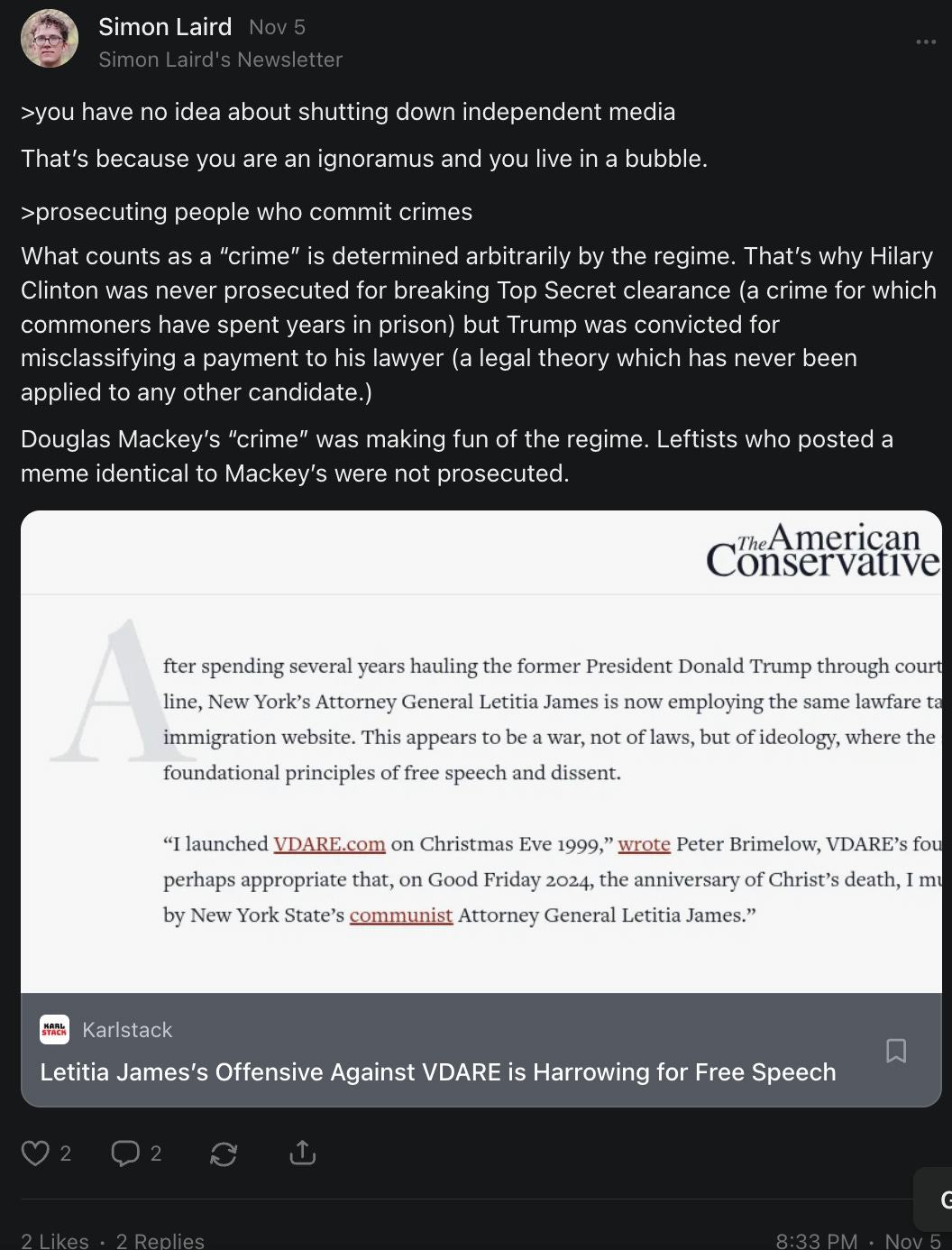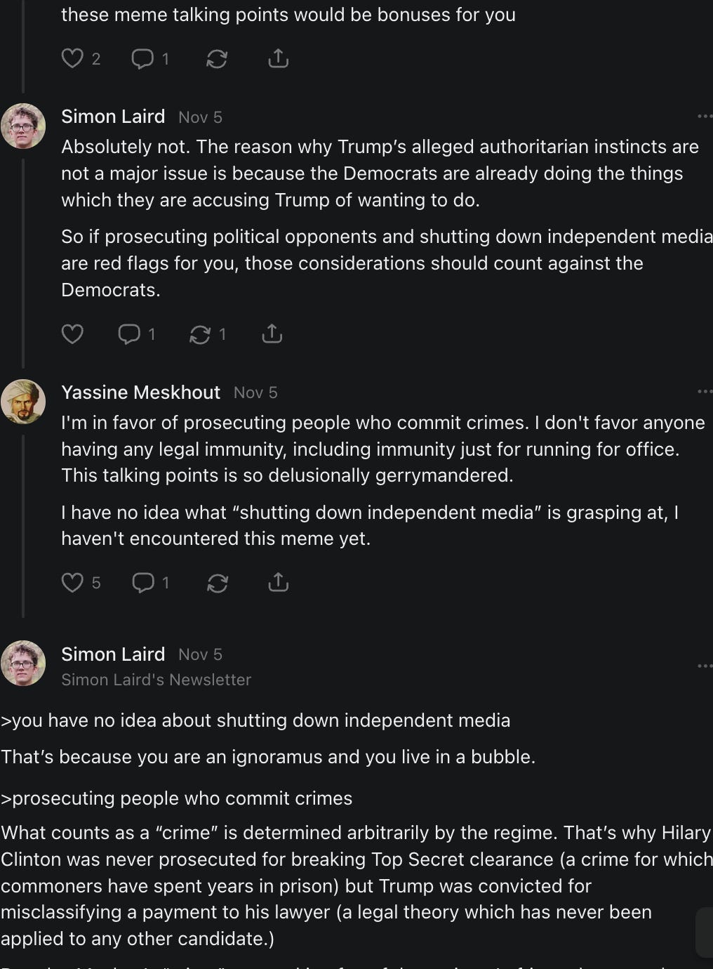 If you think I am exaggerating in my description of the ludicrous excuses Yassine Meshkout gave as justifications for state violence against people he doesn’t like, here are the examples. i.Douglas Mackey case. In 2016 Douglas Mackey shared a meme which urged Hillary voters to vote by text. The Biden administration prosecuted Mackey and sentenced him to prison. Yassine Meshkout made a post defending this. Yassine’s post never mentions that a Hillary supporter shared a video urging Trump supporters to vote by text, but she was never prosecuted. ii. Yassine Meshkout’s post says that he “asked [Simon] for details” about the VDARE case. He did not. In his summary of the VDARE case he says that the New York Government’s intimidation of VDARE is “a loooong ways out from” the claim that “Kamala Harris wants to shut down independent media outlets.” Again, I did not make the claim that Kamala Harris personally wanted to do that, but it’s also not a long ways from that. When the American press reports that some third world government drove an independent media outlet out of business, they’re often talking about the same kind of tactics that the New York Government used against VDARE. iii. Putting Trump in prison for mishandling classified documents. Yassine justifies this by saying that he’s in favor of prosecuting people who commit crimes. Of course Yassine did not say that Hillary Clinton should be prosecuted for mishandling classified documents, even though everyone agrees that she committed a crime. Back in 2016 prosecuting a presidential candidate was (not Yassine’s words) a “violation of democratic principle that distinguishes free polities from authoritarian ones.” But in 2024 it was flipped. Suddenly, even a presidential candidate could be prosecuted because no one is above the law. These people have absolutely no respect for the principle of equality before the law. They would make up bullshit excuses to justify literally anything. If Yassine had been raised in Russia, he would ignore the fact the Navalny was killed for being a dissident, and he would make up an excuse about how actually Navalny was imprisoned for being a Neo-nazi or whatever.