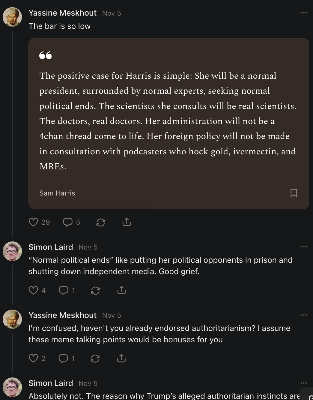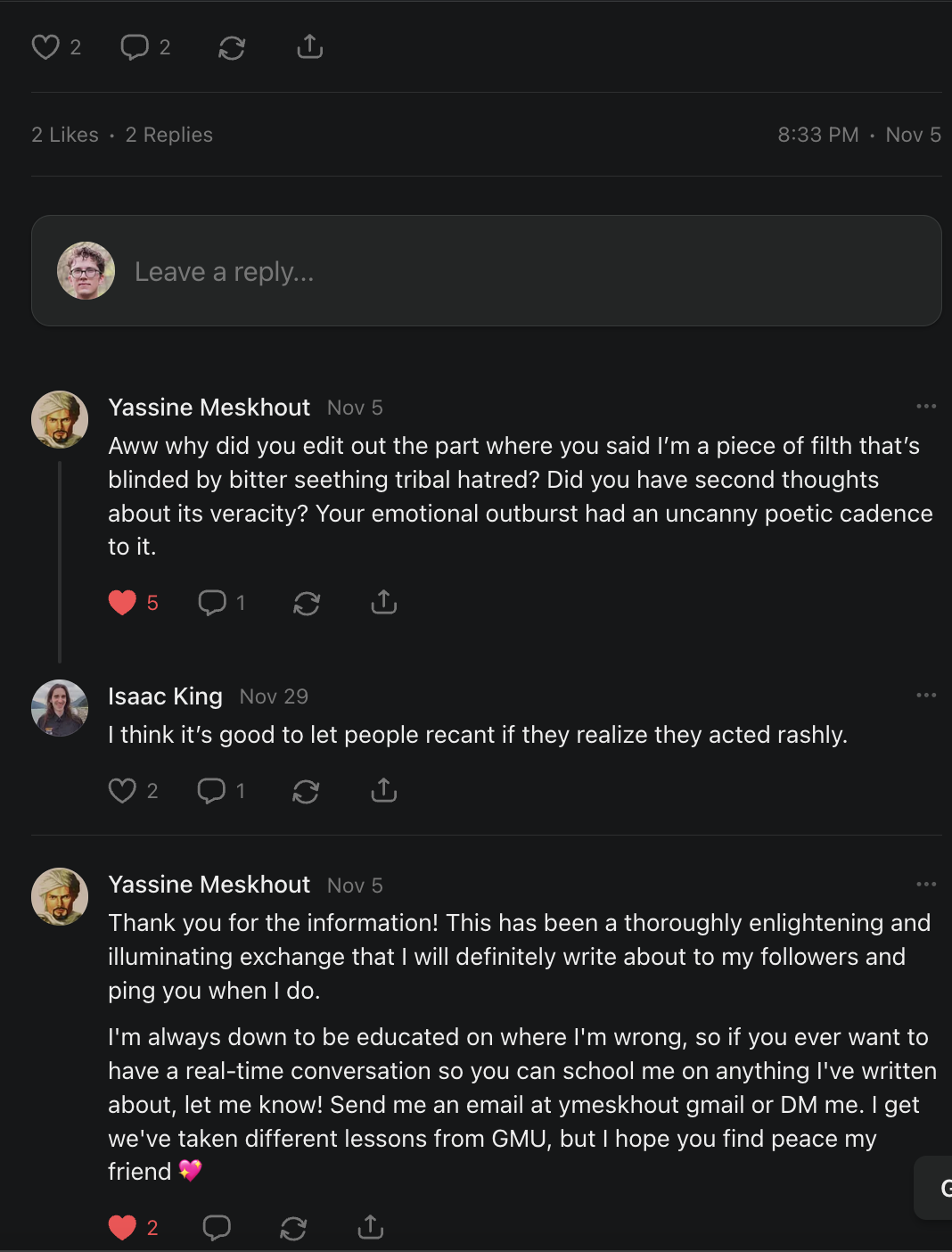 AD HOC RATIONALIZATION OF INTENSE TRIBAL AGGRESSION. This is the real problem. The gist of Yassine Meshkout’s post (and the gist of our substack Notes exchange) is that: i. Yassine presents examples of extreme, illiberal, authoritarian action being taken against people he doesn’t like. ii. At some level, Yassine realizes that those actions starkly violate the liberal principles he claims to hold. iii. Then Yassine lies or lies by omission, OR invents a bunch of ludicrous, ad hoc, arbitrary reasons why the illiberal state aggression against people he dislikes is actually like totally ok and it actually doesn’t contradict liberal values because of some obscure bullshit reason that Yassine made up just now for this specific circumstance, and only people as sophisticated as Yassine are sophisticated enough to understand this bullshit reason, and it’s actually like so nuanced and complex so who even knows anyways, and if you believe in equality under the law then you’re like totally uptight, man. I think we’ve all encountered people like Yassine. Let’s speak frankly about this. THE MOST PROBABLE EXPLANATION OF WHY PEOPLE ACT LIKE YASSINE IS BECAUSE THEY ARE VICIOUS, AGGRESSIVE TRIBALISTS.They are acting out of the deep evolved instinct to override their conscience when there is an opportunity to brutalize the other tribe. At some deep level they know that it’s wrong to put innocent people in prison, so they invent some bullshit excuse to rationalize it. Let us not forget that there are psychopaths in this world. There are people who either do not have a conscience or choose to ignore their conscience, but pretend that they follow a moral compass. When someone cheers on acts of vicious aggression against outgroup members, and makes up transparently ridiculous justifications for doing so, the most parsimonious explanation is that they do not care about truth or fairness and their pretended morality is just a front for their bitter, seething tribal hatred. (side note: some people think that it is somehow wrong to express negative assessments of people. I disagree. I think that we should tell the truth.) As dissidents and as Westerners, we need to get serious about this. People like Yassine may not consciously want us dead, but if Yassine’s friends pulled you out of your house tomorrow and killed you or imprisoned you, the odds are greater than 50% that Yassine would make up some bullshit excuse about how you deserved it. If Yassine had been raised in Russia, he would ignore the fact the Navalny was killed for being a dissident, and he would make up an excuse about how actually Navalny was put on trial for being a Neo-nazi or whatever. Rounding up and murdering Kulaks doesn’t require every person to be a psychopath, it just requires enough people to be like Yassine. Yassine appears to be a vile piece of filth, and I initially said so. A little while later I edited my words because while Yassine certainly appears to be an evil person, I have only interacted with him in substack Notes; I have never met him in person. Yassine’s new post seems to confirm my suspicions about his character, but we need to be precise when we say that someone is an evil person; we don’t want to let that serious accusation get watered down from overuse.