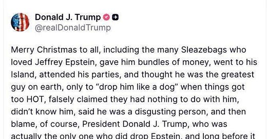 In an unhinged Christmas message about Jeffrey Epstein a tormented Trump confesses.......my latest 👇
