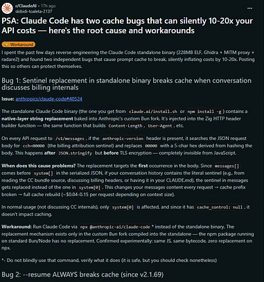 First, it demonstrates the crazy utility of caching. First bug is basically caused by the replacement of a simple key in the message, which breaks caching due to a key mismatch. Second bug is a simple shift in the position of parts of the structure of messages sent to the server, which causes past cache relating to session context to be ignored, and rebuilt from scratch. Cache breaking contributes to a spike of ~10-20x in token consumption.