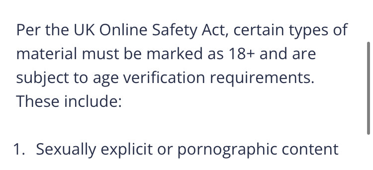 Now in the UK Substack writers will automatically be censored if they include sex or “realistic” violence. So fiction cannot be read without age verification. This would rule out War and Peace, Anna Karenina, Ulysses, Moby-Dick, The Great Gatsby, Don Quixote, Hardy, Updike, Roth, Bellow, Hemingway, Faulkner, Proust, Pushkin, Lermontov, Chekhov, Ibsen, Turgenev, Conrad, etc etc etc