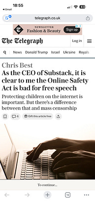 Substack ceo Chris Best writes an oped in the telegraph criticizing the UK online safety act