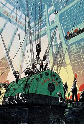 Created in 1971, the multicolored woodcut The Campaign (《会战》) employs a cinematic panning technique and upward-angled perspective to emphasize the monumental dynamo—embodying the world’s most advanced technology—and the towering factory buildings. The work highlights both the grandeur of industrial progress and the spirited vitality of the workers, their passion vividly conveyed through scenes of collective labor.