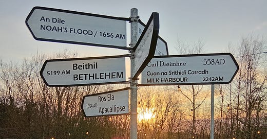 To overegg the point I recall a quarter century back, the early years living on this northern tip of Moytura, I enjoyed then Michael Poynder’s book Pi in the Sky. He was an Englishman and a gemmologist by profession who from what I could construe likely saw the globe as one big jewel, a fabergésque rotundish one. He loved leylines and therefore drawing straight lines was his delight, oftener than they possibly should they lead to his very door, a line here from Great Giza and or another between Lough Crew, Mont St. Michelle, the Glaston Tor or the tearmann of Tara with a deflect off Stonehenge for measure and again leading to his half door. His homestead was on the northeastern slopes of the Bricklieve Mountains where the Carrowkeel cairns, bog igloos these 5000 years, steady on despite that many facing sunsets, moonups in their own rites. Those hills parallel our hills across Lough Arrow, parallel Moytura. Might Poynder’s fancy be a product of so many years of living between the drizzles and rain horizontals for that long that you conjured justifications for ones ardour.