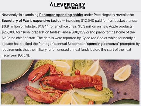 NEWS: Trump officials are floating a supplemental spending bill for the Iran War - while Pete Hegseth’s Pentagon just spent $6.9 million on lobster in a single month, $1,844 for an office chair, $26,000 for “sushi preparation tables” & $98,329 on a grand piano for the Air Force chief of staff.
