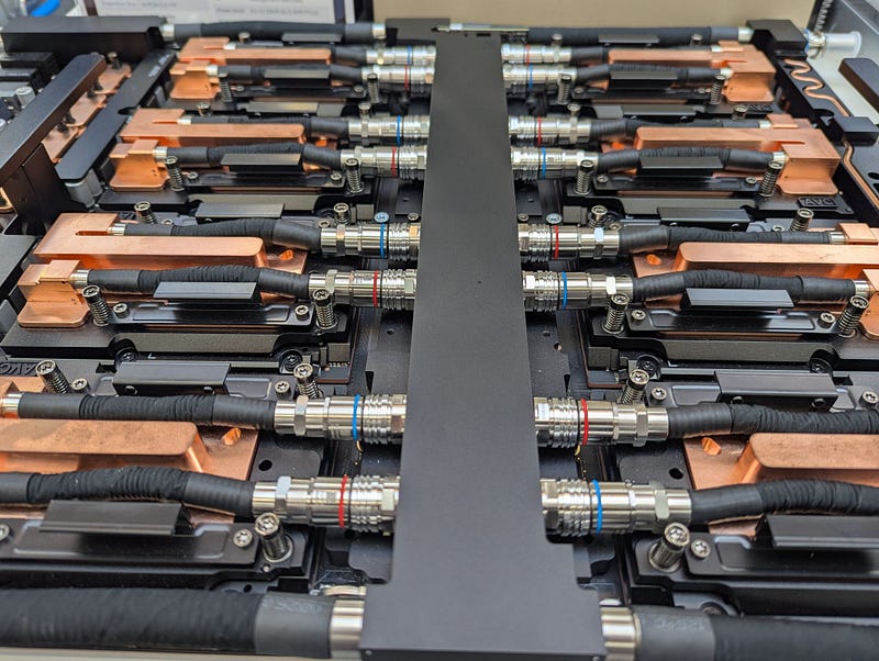 A liquid-cooled GPU tray, but this one has 8 GPUs and I don't see any Grace CPUs?