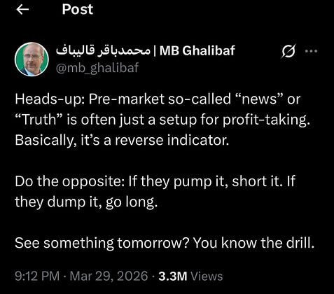 Iran’s speaker of the parliament gives you the playbook for trading US markets. What a timeline