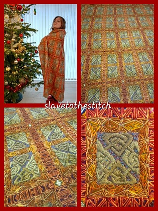 Here, I tried to stitch the design for Mair's blanket like the cover of an Irish magical medieval manuscript & she said it made her feel like a queen 😊