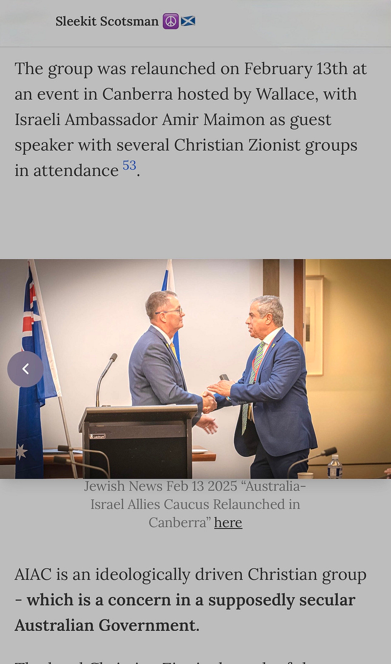 But a group “Australia/Israel Allies Caucus” relaunched in February last year. Basically a bipartisan Christian Zionist organisation for “faith based diplomacy” in our Parliaments. Defence industry heavy with Shadow Defence Minister Wallace as the Chair. Same groups in multiple parliaments globally all co-ordinated from Israel.