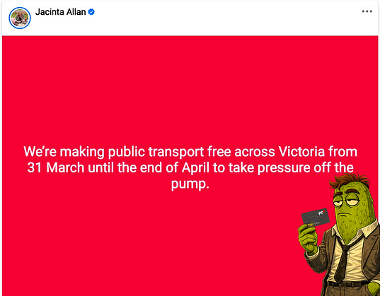 The point isn’t that everyone in Victoria can suddenly abandon their car and frolic onto a tram. Plenty of people can’t. Regional workers, tradies, shift staff, parents doing the school-and-work relay... they still need the car.