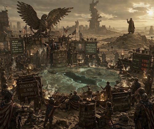 The Post-American Empire, now a fading constellation of strip malls, cities made from disused aircraft carriers and sacred cable news archives, gathers once more for one of its oldest ceremonial observances: The Threatening of the Strait.