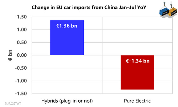 January–July 2025, EU imports from China tell a clear story. Pure electric cars (BEVs) fell by €1.34 bn while hybrids (plug-in and non-plug-in) rose by €1.36 bn. That is a near one-for-one value swap. It looks like rerouting around policy rather than hearts and minds changing overnight.