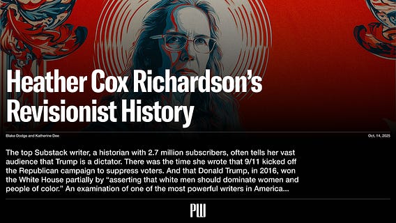 heather cox richardson, the most influential writer in america, is basically doing daily political fan fic for millions of terrified cat moms. the canonical piece on this incredible movement from Blake Dodge and Katherine Dee