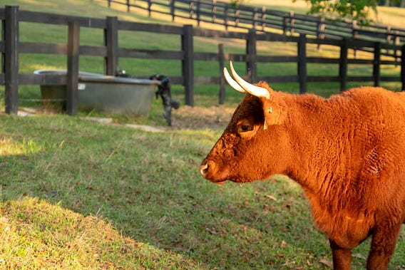 Morning sunshine and a dog drinking from cattle trough.