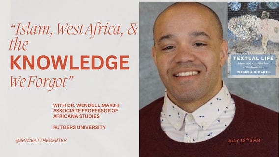 Excited to share that Dr. Wendell Marsh, Associate Professor of Africana Studies at Rutgers University, will be joining us for our final discussion on “Islam, West Africa, and the Knowledge We Forgot” to discuss his forthcoming book, “Textual Life: Islam, Africa, and the Fate of the Humanities” (Columbia University Press).