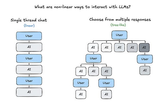 The AI chat sidebar interface is a linear, single thread way to navigate a search space. Ask for one thing, get one response, give feedback, repeat.