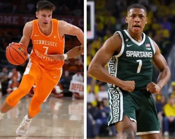 It's the Tennessee Volunteers vs Michigan St. Spartans for the 2026 NCAA Men's Basketball's best college team uniform design.