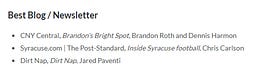 Well, lookie here. I know that Dirt Nap has been on pause, but wanted to share that it is a finalist for a Syracuse Press Club award this year in the best blog/newsletter category.