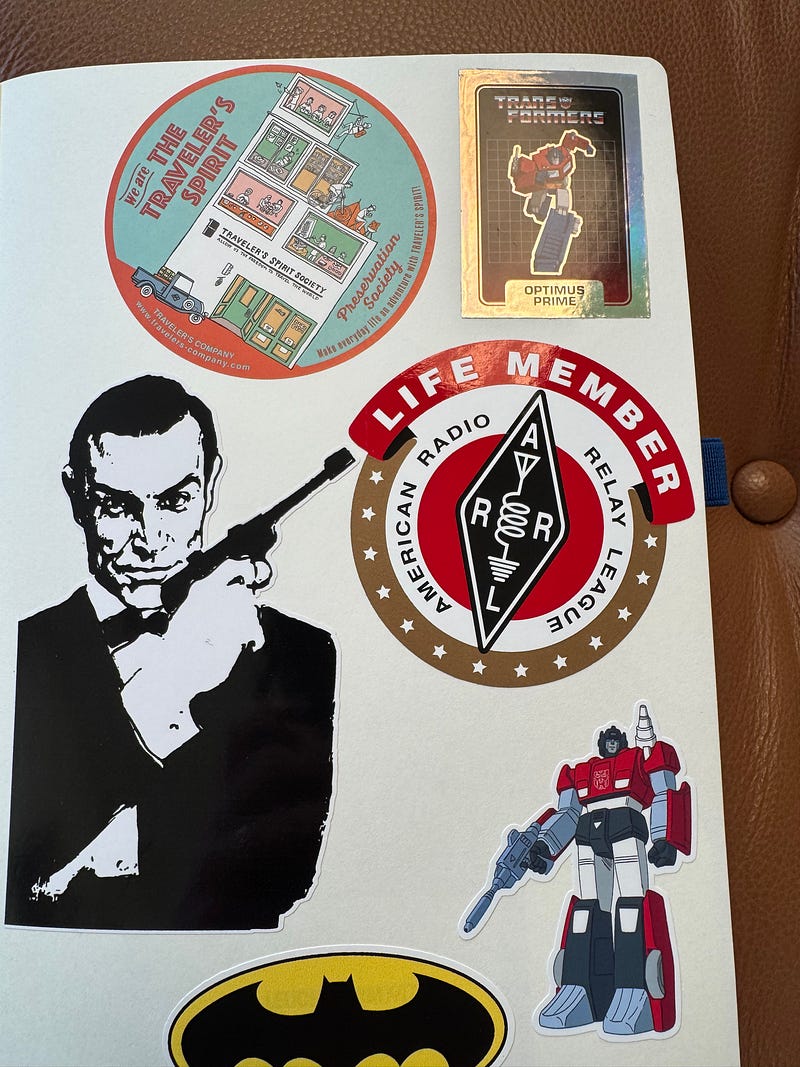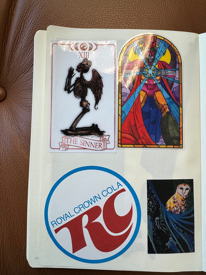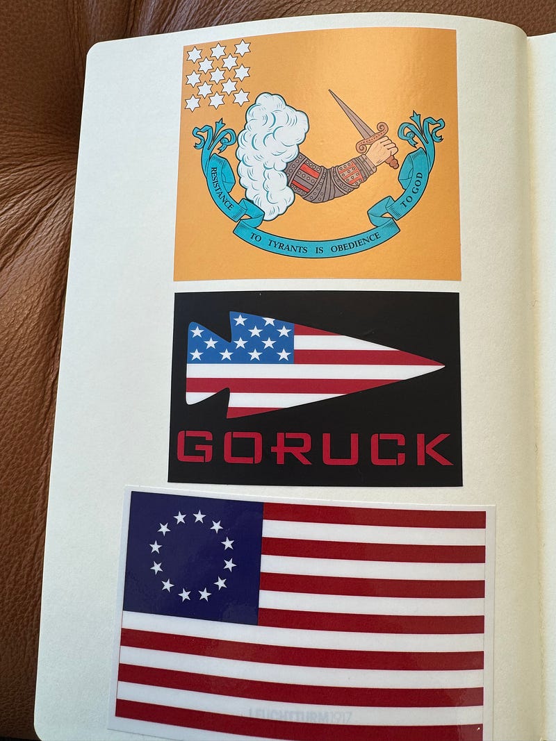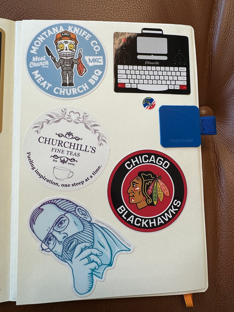 New journal, same strong sticker game. I feel especially excited that I finally used the sticker of Tyler Cowen! And with the celebration of America’s 250th birthday, I'll have a bunch of historic flag stickers this year.
