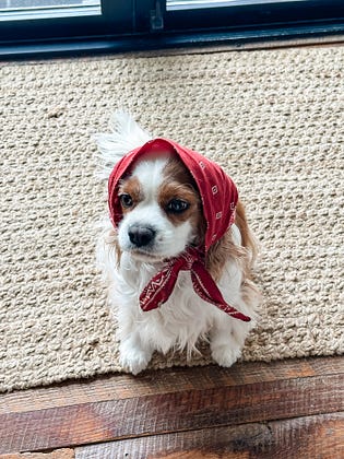 We put this on him when he eats because it keeps his ears out of his food. And also because it guarantees I laugh twice a day.