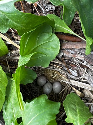 We were pulling out all the old winter plantings from our beds when we came across this beautiful nest with three eggs.