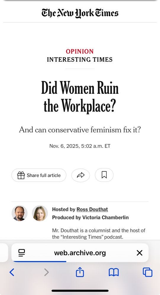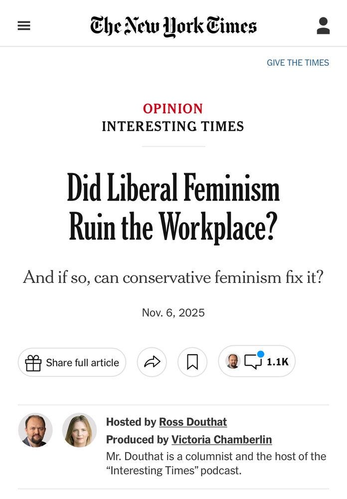 Respectfully, I think it’s good that the NYT facilitated this debate. This is a conversation that is happening. A LOT of people—a lot of women—have bought into the feminization-ruining-the-world thesis. It is good for liberal feminists that a thinker like Leah Libresco Sargeant, who is widely respected on the right, was given (and accepted!) the opportunity to vigorously push back on Andrews’ thesis. It makes it clear in a very visible way that you can be a skeptic of a certain flavour of modern liberal feminism without buying into the idea that women’s entry into the labor force is to blame for all of our social ills.