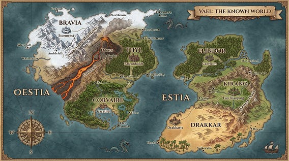 The Signet takes place in Bravia, one of three countries on the western continent, Oestia in a world known to its inhabitants as Vael.
