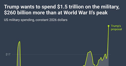 NEW: Trump’s proposed $1.5 trillion military budget compared to enacted US military budgets since 1940. (Spoiler: Trump wants a budget 21% larger than 1945’s)