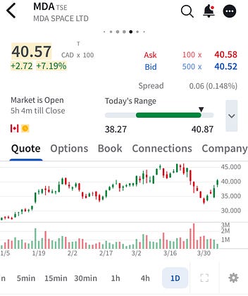 $MDA Space making a move higher today having picked up a buy rating from JP Morgan, they give a 25% upside target and base the bull thesis on becoming a prime contractor of Defense satellites. More small progress today on the portfolio but it is baby steps.