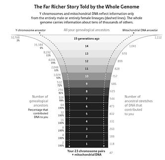 The number of ancestors you have doubles every generation, but the segments of ancestral genomes contributing to your genome increases arithmetically by 71 per generation. So by 8+ generations, it is likely that you have some ancestors who did not contribute to your genome. By 15+ generations back, this is almost a certainty. See figure below to watch this play out. The figure is borrowed from David Reich’s Who We Are And How We Got Here who adapted the data from a blog post by population geneticist Graham Coop.