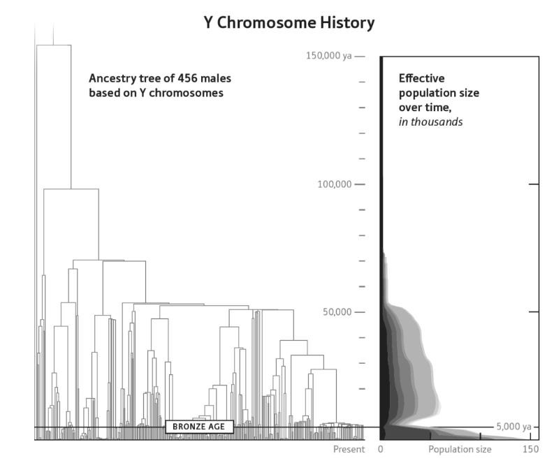 The male-lineage Y chromosome types carried by these groups were absent in India and Europe before the Bronze age, but are predominant in both places today, Reich says. Much of this ancestry is the result of what is known as a “star cluster,” when the genes of one very powerful man appear in millions of descendants. Reich estimates that 20 to 40 percent of Indian men and 30 to 50 percent of Eastern European men descend from a single man who lived between 6,800 and 4,800 years ago. In Iberia, Reich’s team uncovered further evidence of sex bias. By 4,000 years ago, genes spread by the descendants of the steppe people accounted for about 40 percent of the ancestry of those populations, with about 60 percent coming from the local inhabitants who had lived there previously. “But if you look at the Y chromosomes—the DNA that people get from their fathers—it was more or less 100 percent from the steppe.”