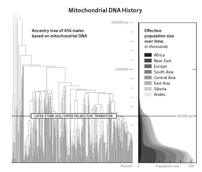 By examining paternal (Y) and maternal (mtDNA) lineages over human history, we can observe striking inequalities. The figures (derived from David Reich’s 2018 book on ancient DNA) below help illustrate how a small number of men have contributed in an outsized way to certain modern lineages.