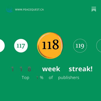 My PeaceQuest Substack is in the top 1% for consistent publishing — 118 weeks in a row. peacequest.ca