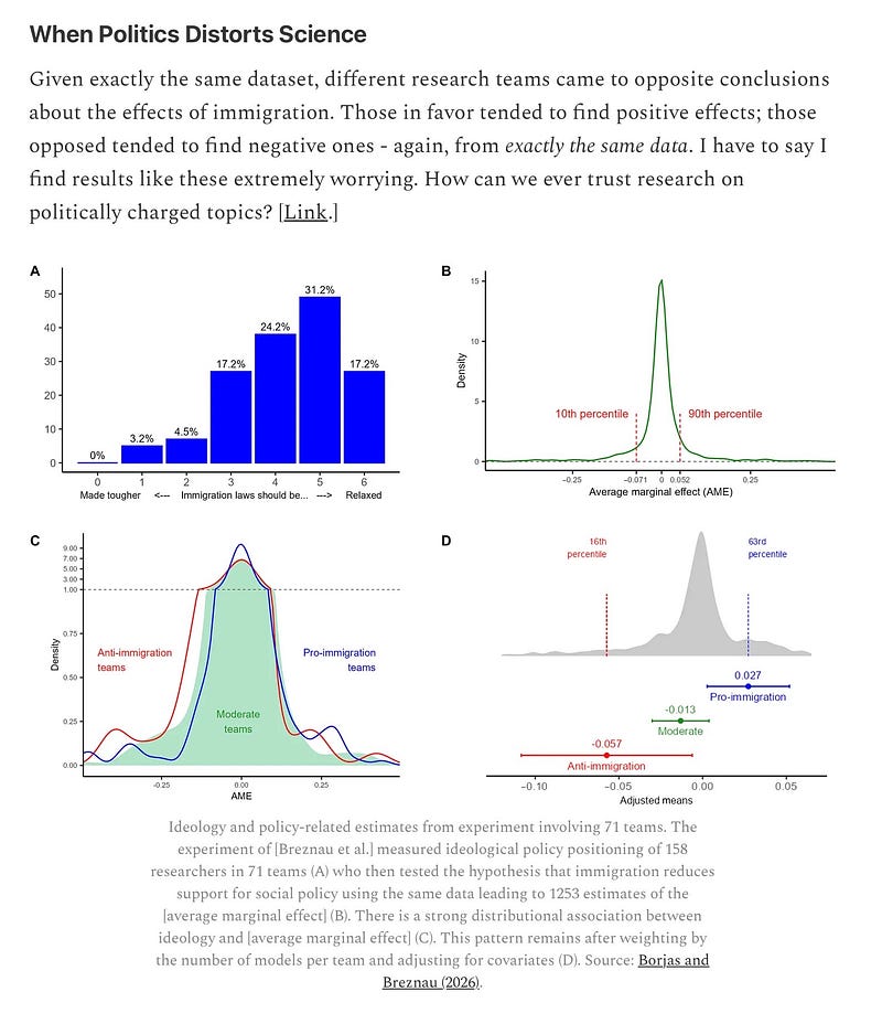 “Given exactly the same dataset, different research teams came to opposite conclusions about the effects of immigration. Those in favor tended to find positive effects; those opposed tended to find negative ones.”